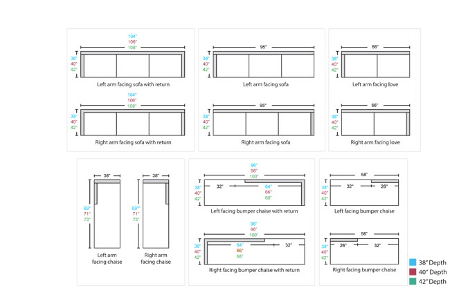 | 1 arm sofa with return | 104/106/108 | 38/40/42 | 36 | 17.5 |