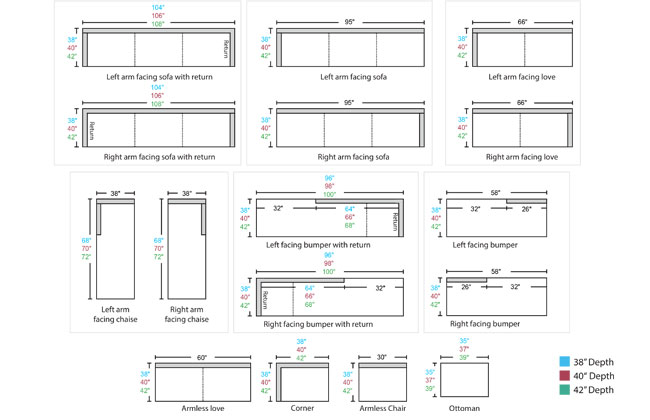| 1 arm sofa with return | 104/106/108 | 38/40/42 | 36 | 18.5 |